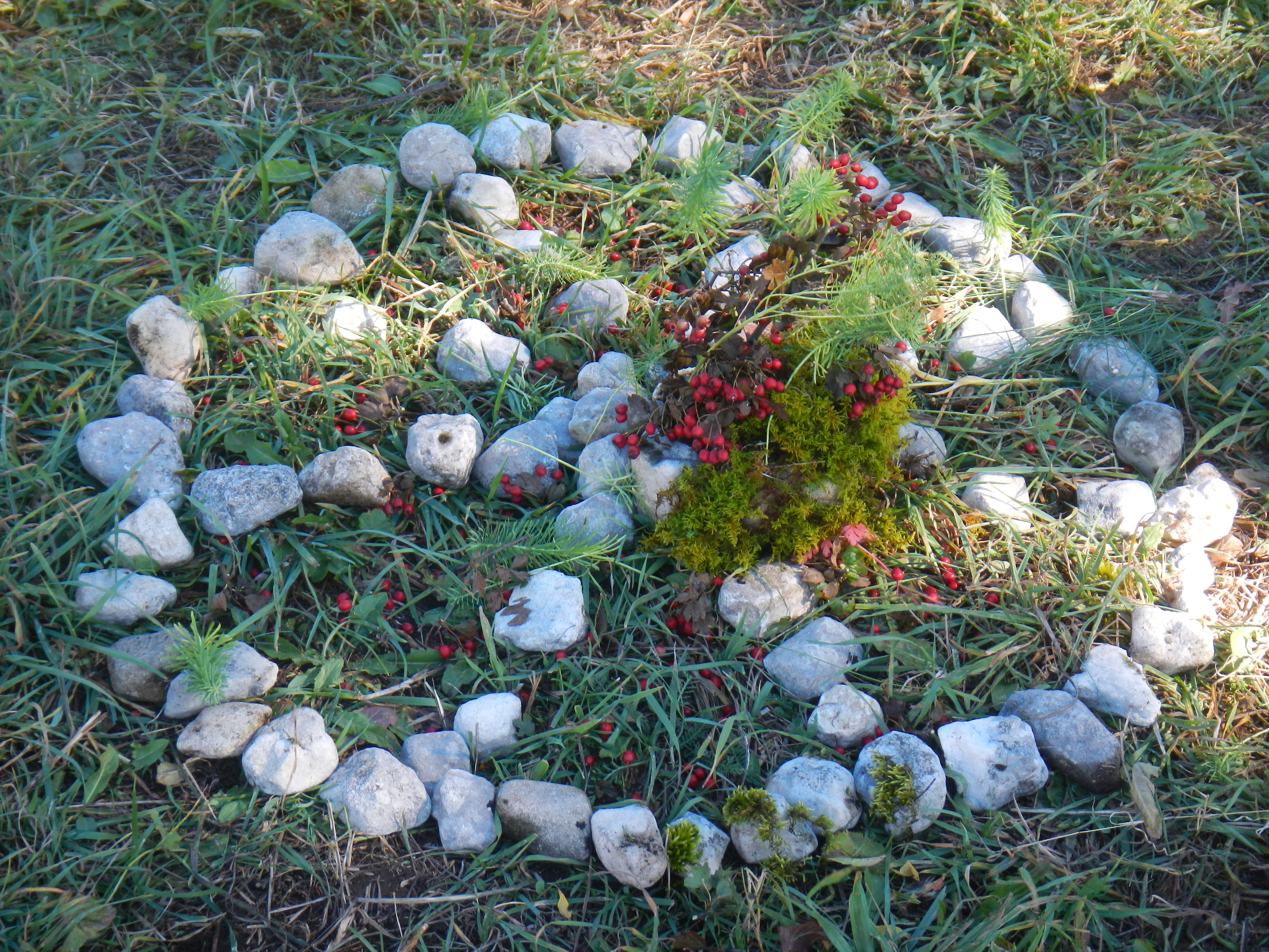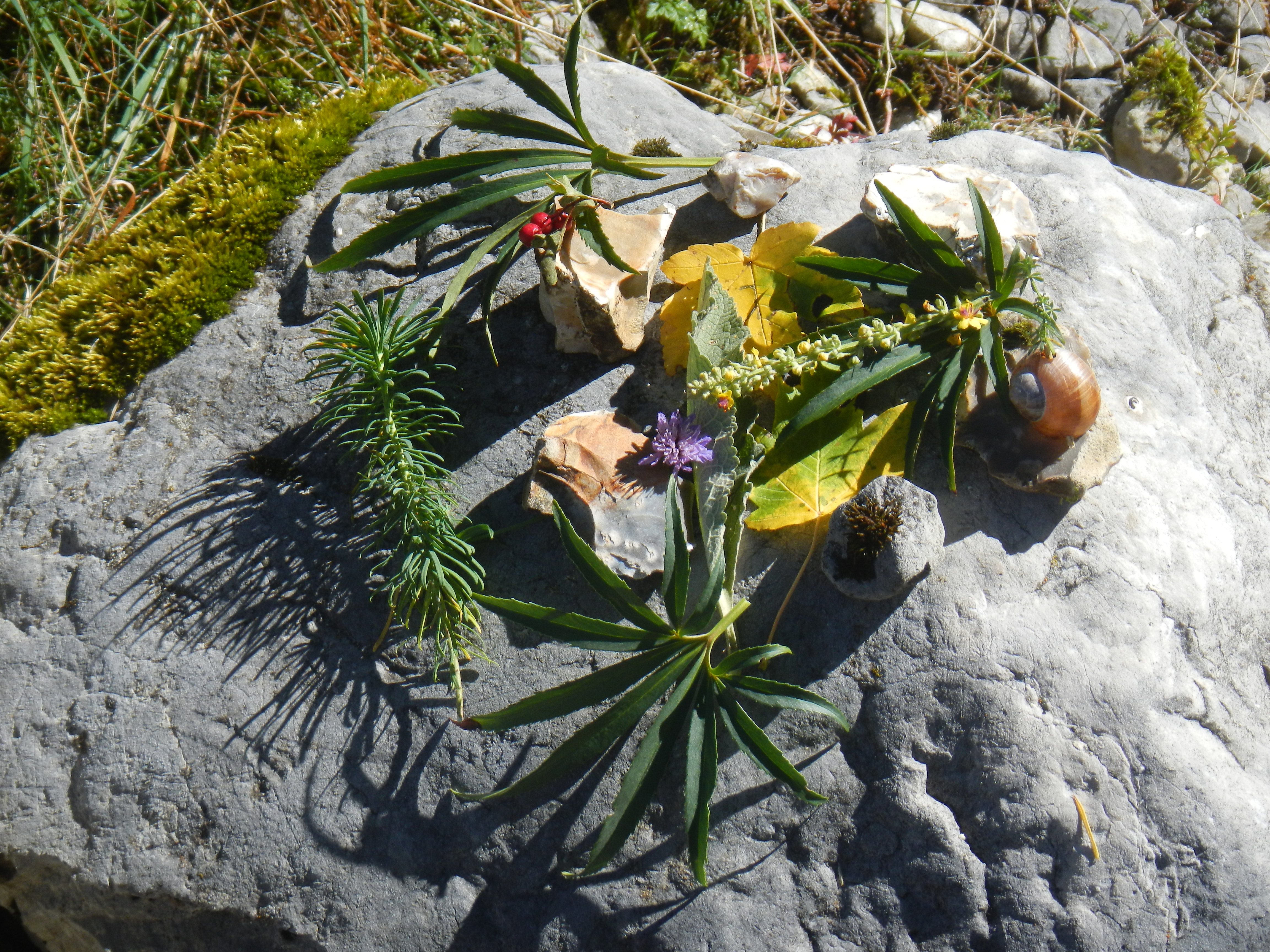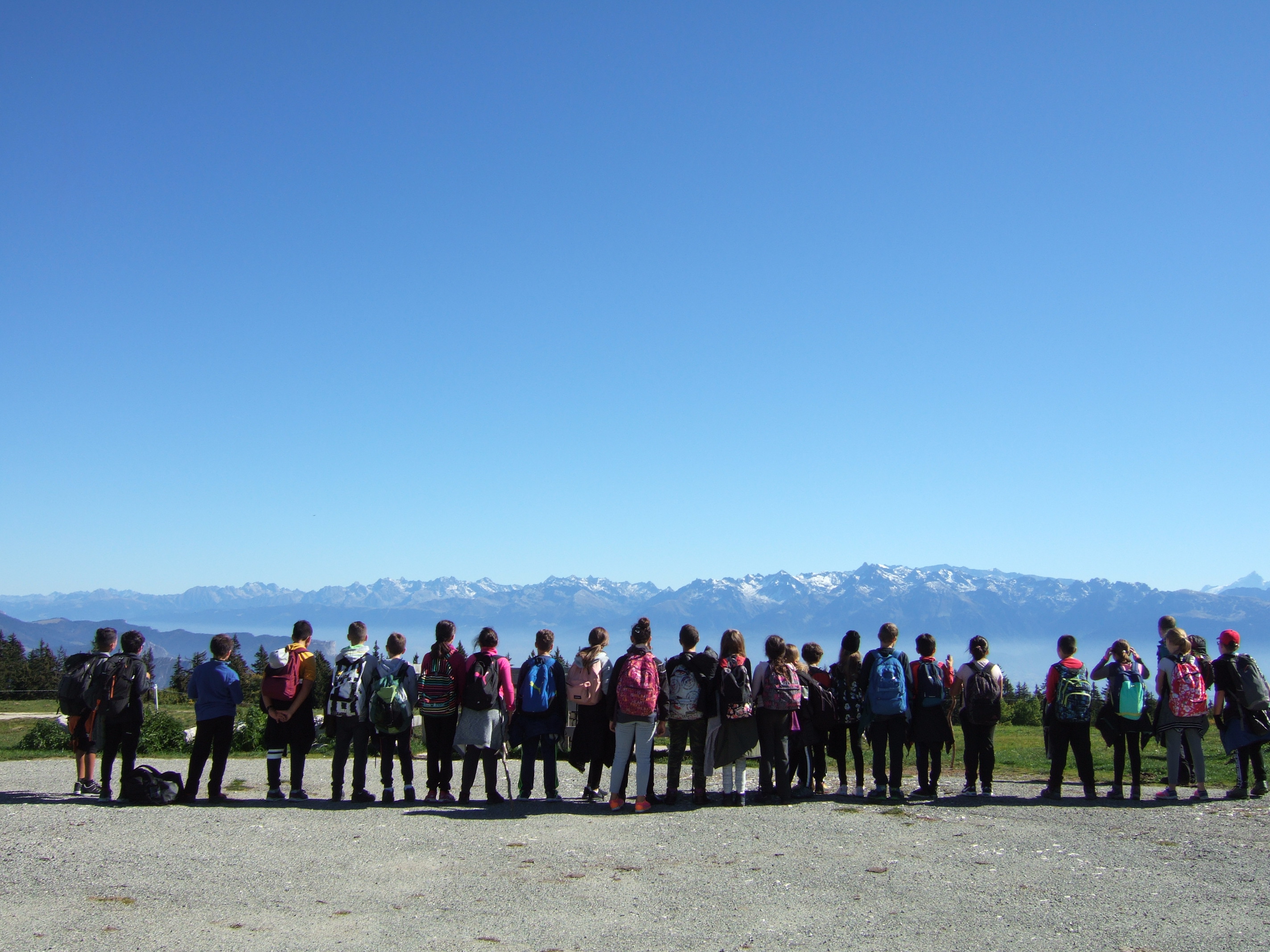 Après une belle ascension entre alpages et forêts et l'arrivée à la Molière, les élèves ont découvert une vue panoramique sur les différents massifs montagneux du Dauphiné: Belledonne, Chartreuse, les Ecrins (en particulier le Taillefer). Le beau temps nous a même permis de voir le Mont Blanc. Ce moment d'élévation (au sens propre et figuré) et de distanciation par rapport à la vie quotidienne a permis aux élèves de porter un nouveau regard sur le monde. Quel contraste avec l'activité du lendemain ! Le Land art ou l'art avec/et dans la nature est une immersion dans la matière, les couleurs et les formes dont voici quelques créations collectives d'élèves. De petits magiciens qui nous montrent la beauté du monde!