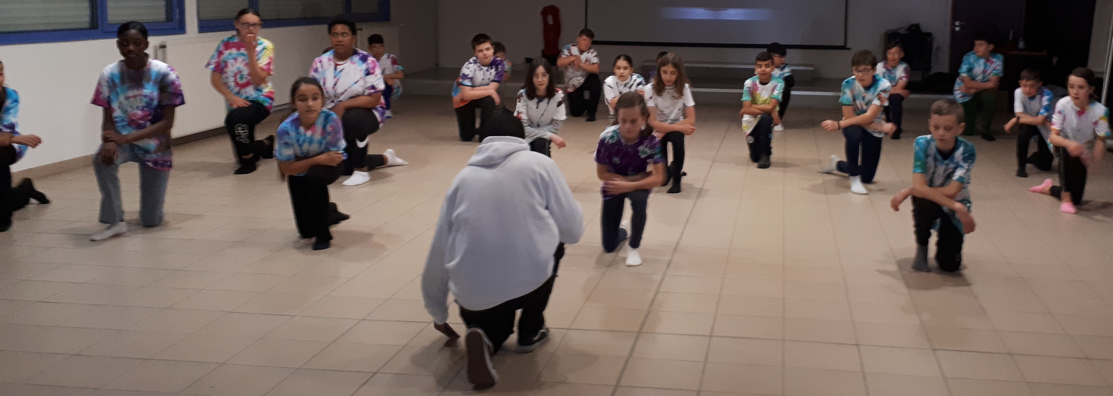 Pour démontrer leurs progrès, les 6B ont fait une représentation le mardi 21 février dans la salle polyvalente, devant les 6C et les 3A. Ils ont d'abord réalisé la chorégraphie collective, puis des petites démonstrations en groupe de trois ou quatre. Ensuite, Sylvain a fait danser les spectateurs, avec beaucoup plus de facilité pour les 6èmes que pour les 3èmes :) !