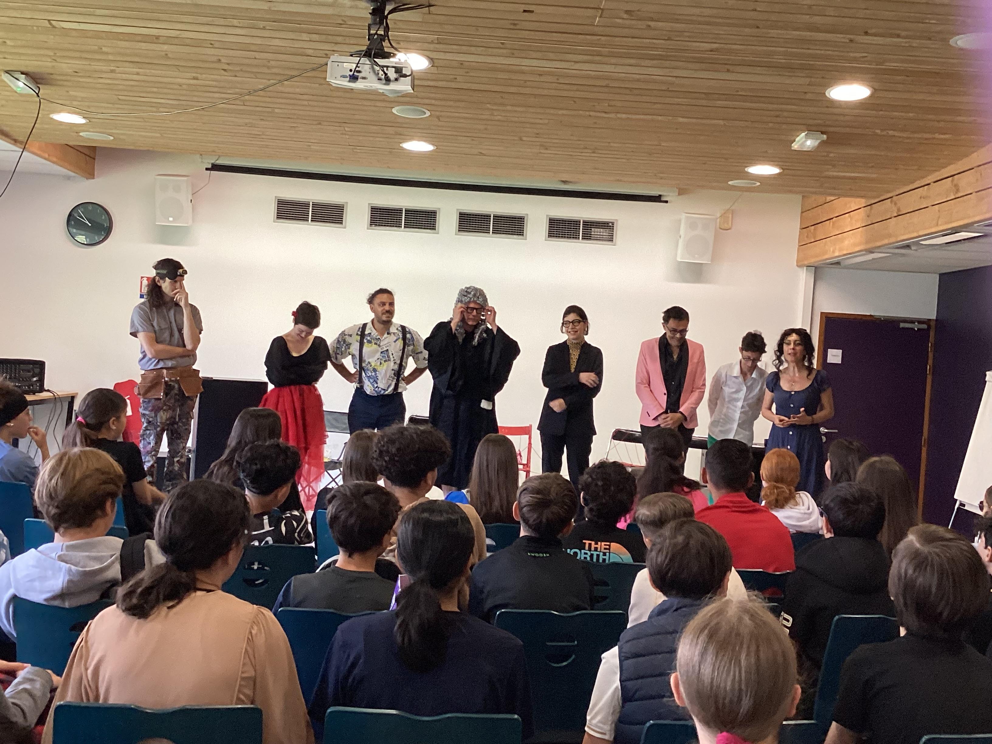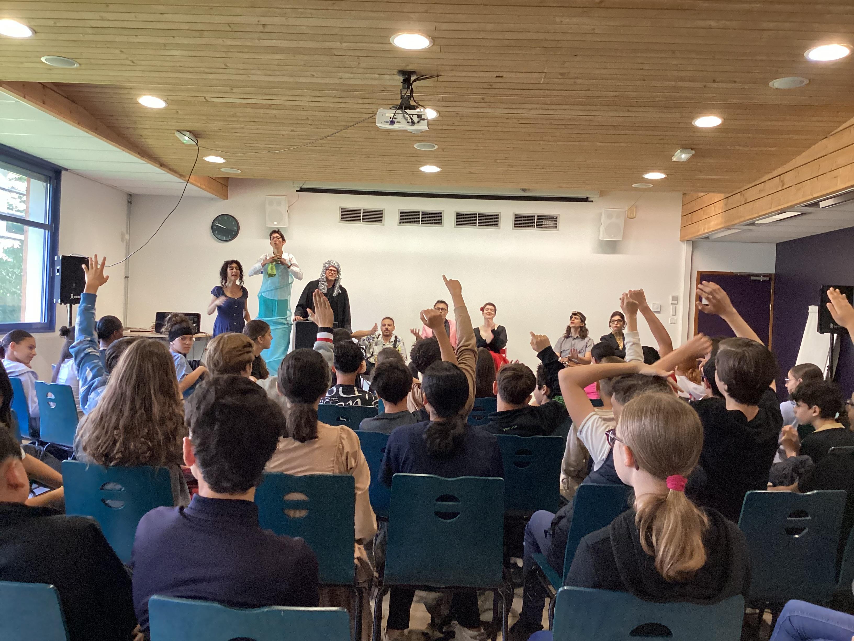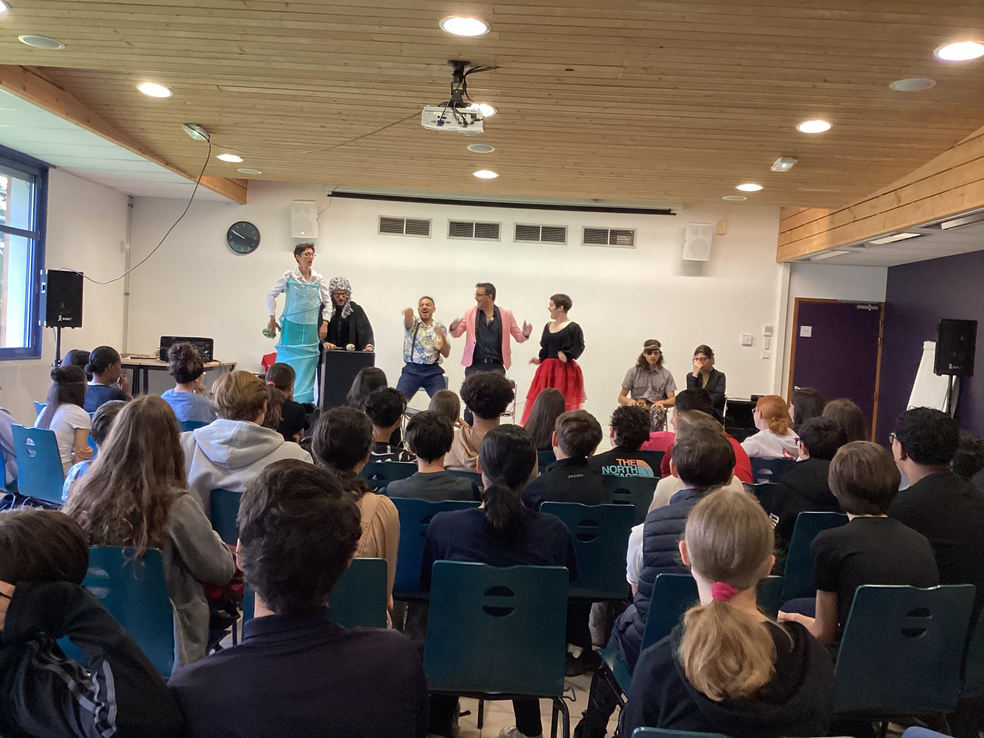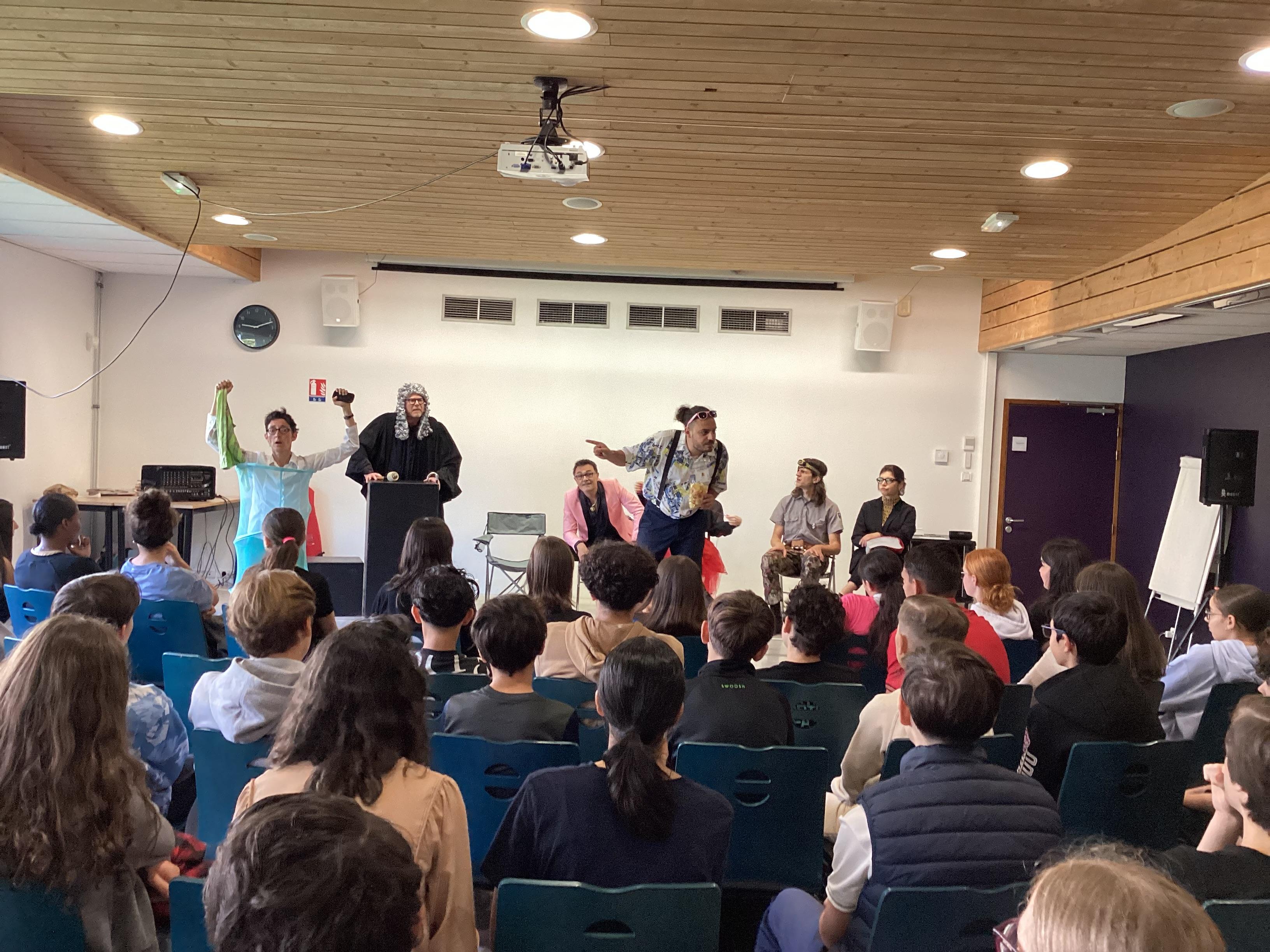 Lundi 17 juin 2024, dans la salle polyvalente du collège, les classes de 4ème ont assisté à la pièce de théâtre "Le Procés", créée et jouée par la compagnie "La Grosse Clique". Les élèves ont ainsi participé en tant que jurés au procès d'une femme accusée d'avoir tenté d'écraser dans sa cuisine Bob la mouche à l'aide d'un torchon.